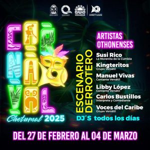 CHETUMAL, 24 de febrero. – Estamos a pocos días para el gran Carnaval Neón de Chetumal 2025, que se celebrará del 26 de febrero al 04 de marzo y que estará lleno de magia, alegría, baile, artistas invitados y mucha diversión.