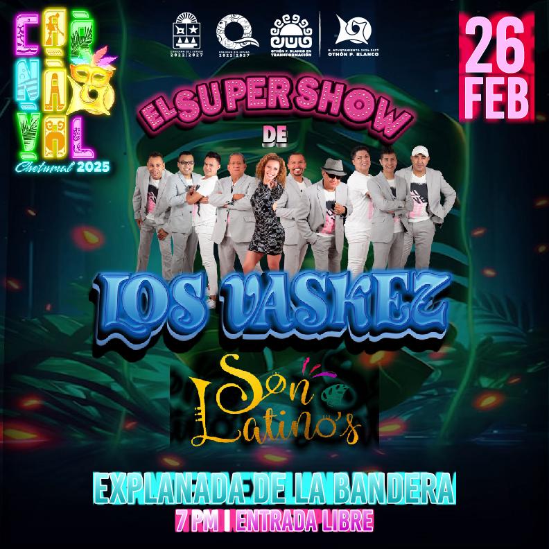 Tras la presentación de las comparsas y la coronación de las Reinas y Reyes del Carnaval 2025, se tendrá el espectacular show musical de Los Vázquez y, al terminar, se presentará el grupo Son Latinos.
