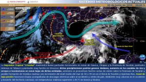 Esta situación mantendrá el temporal de lluvias puntuales torrenciales en zonas de Oaxaca, Chiapas y la Península de Yucatán; puntuales muy fuertes en Tabasco y el sur de Veracruz.