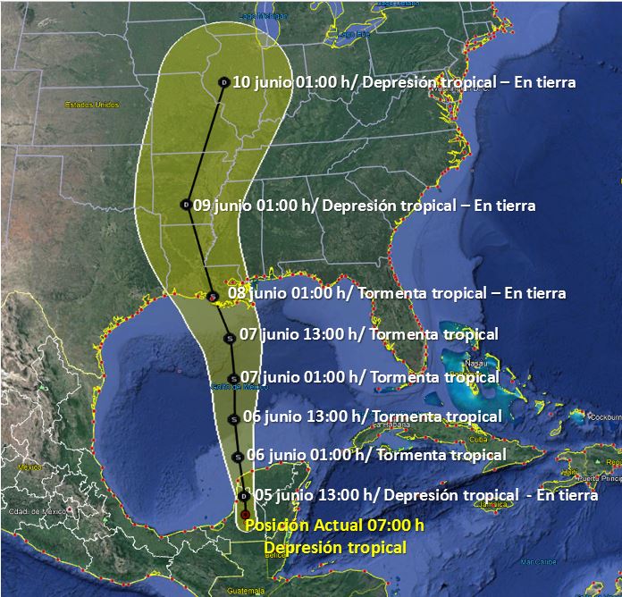 Para hoy, se pronostica que el centro de la Depresión Tropical “Cristobal” continúe su desplazamiento hacia el norte sobre Campeche y el occidente de Yucatán, para que durante esta noche ingrese al Golfo de México, en donde se podrá intensificar nuevamente a Tormenta Tropical.