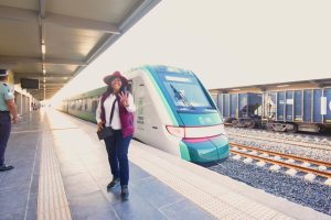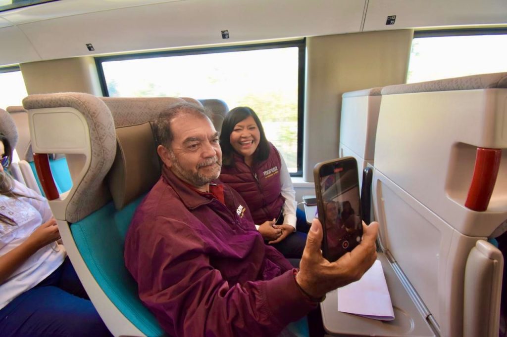 Mildred Ávila, aspirante a diputada federal en el distrito 04 y Aldana Navarro, candidato en el 03, aprovecharon una pausa en sus actividades proselitistas, para experimentar de primera mano los avances y la operatividad del tren, una de las obras insignia del actual gobierno.