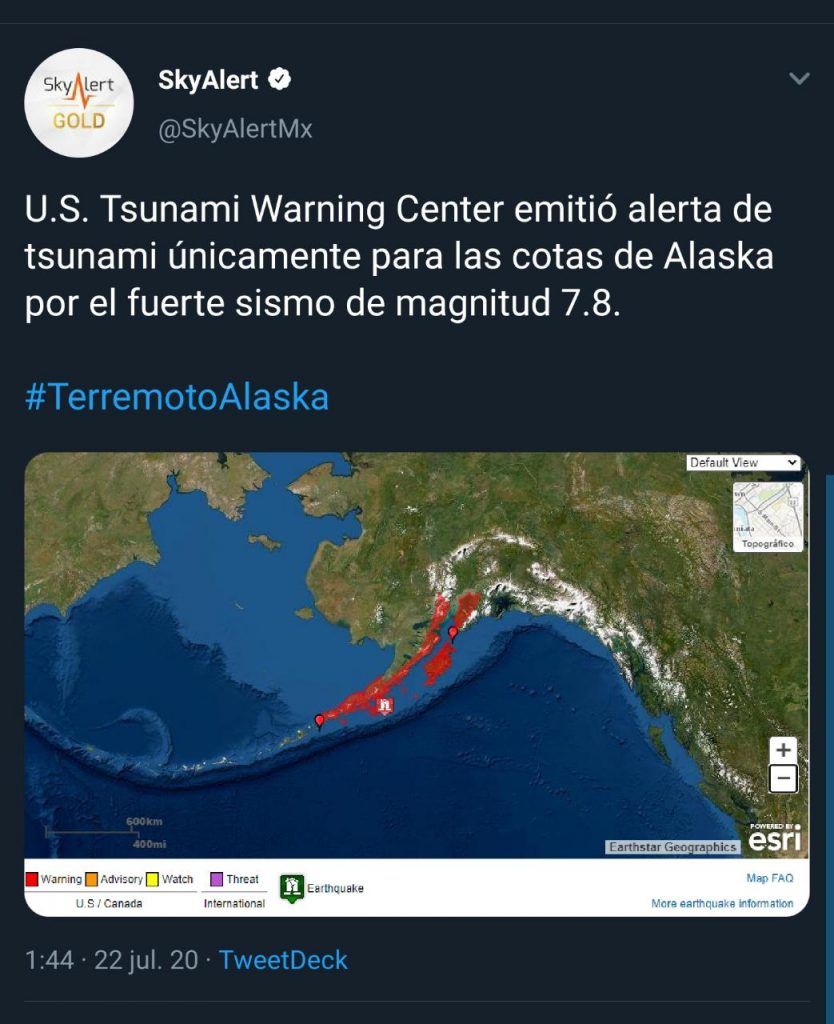 Alaska.- Las autoridades de Estados Unidos de Norteamérica emitieron una alerta de Tsunami para las costas de Alaska, luego del sismo de 7.8 grados que se registró en las primeras horas de este 22 de julio.