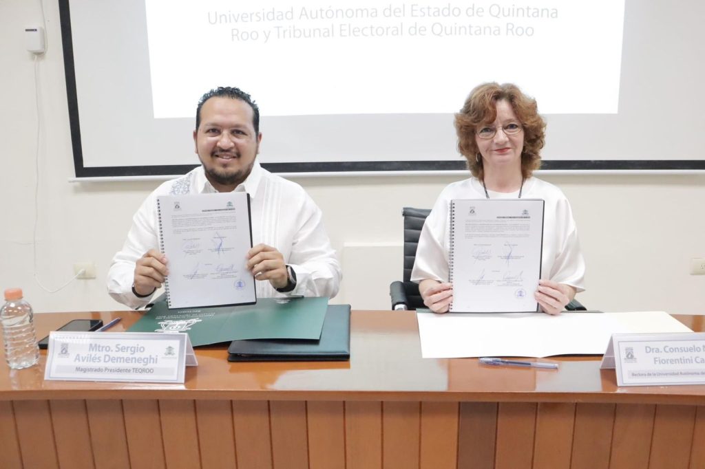 Por su parte, la Rectora de la UQRoo, Dra. Natalia Fiorentini Cañedo dijo que la firma representa un compromiso firme con la promoción de los valores democráticos y el fortalecimiento de la cultura de los derechos político-electorales, la legalidad y el debido acceso a la justicia electoral en el Estado. “A medida que avanzamos en esta nueva etapa de colaboración, estamos seguros de que lograremos grandes beneficios en la formación y concienciación de nuestros estudiantes y ciudadanos”.