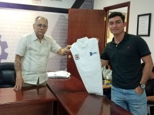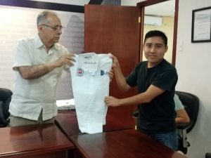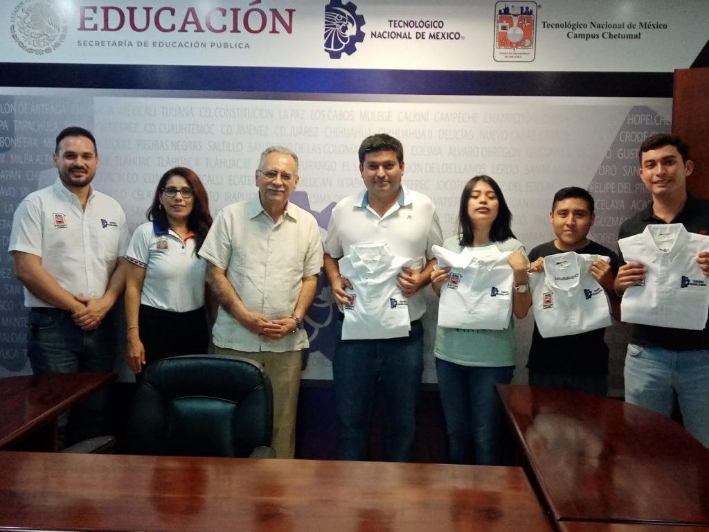 Para darles la despedida, el director del Instituto Tecnológico de Chetumal, Mario Vicente González Robles y la subdirectora académica del plantel, Ángeles Navarrete Marneou les entregaron uniformes en los que están bordados los logotipos del ITCH así como del Sistema Tecnológico de México, para que les sirva de identificación con sus pares durante los cinco días que durará el evento.