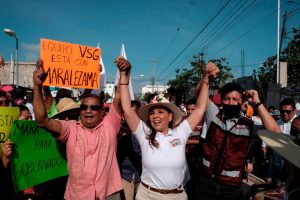 Mara Lezama fue recibida en la colonia Solidaridad con porras, cantos, consignas de apoyo, carteles y mantas con mensajes de respaldo –“Bienvenida a tu casa, Chetumal”, decía una pancarta–. Ahí dijo que viene a hablar con el pueblo, a conocer los flagelos de hombres, mujeres, jóvenes y niños y decirles que hará un gobierno de la 4T bajo los preceptos del Presidente. Los conservadores no quieren que lo logremos, pero “el pueblo unido jamás será vencido”, expresó.