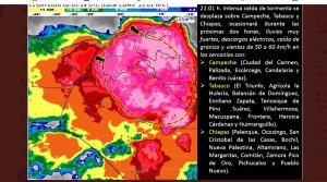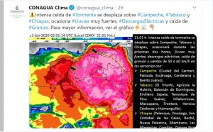 “Intensa celda de #Tormenta se desplaza sobre #Campeche, #Tabasco y #Chiapas, ocasiona #Lluvias muy fuertes, #Descargas Eléctricas y caída de #Granizo.”