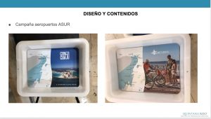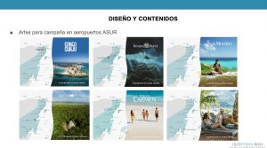 Por parte del área de Mercadotecnia, se informó sobre la creación de diseños y contenidos para publicaciones de prensa, espectaculares, pabellones en ferias y publicidad como los artes de la campaña de mapas que se incluyó en las bandejas del área de filtro de seguridad de los aeropuertos de ASUR de todo el país.