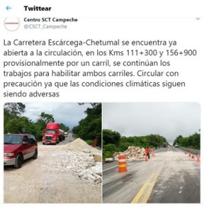 “La Carretera Escárcega-Chetumal se encuentra ya abierta a la circulación, en los Kms 111+300 y 156+900 provisionalmente por un carril, se continúan los trabajos para habilitar ambos carriles. Circular con precaución ya que las condiciones climáticas siguen siendo adversas.”